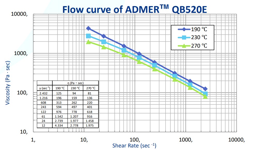 • QB520E: Although it has low flowability, it does not require pre-drying, simplifying preparation for multilayer co-extrusion processes. Its melt viscosity-shear rate profile (rheological profile) helps to precisely control layer thickness in co-extrusion. Attention should be paid to the maximum temperature limit (300°C) to avoid decomposition.