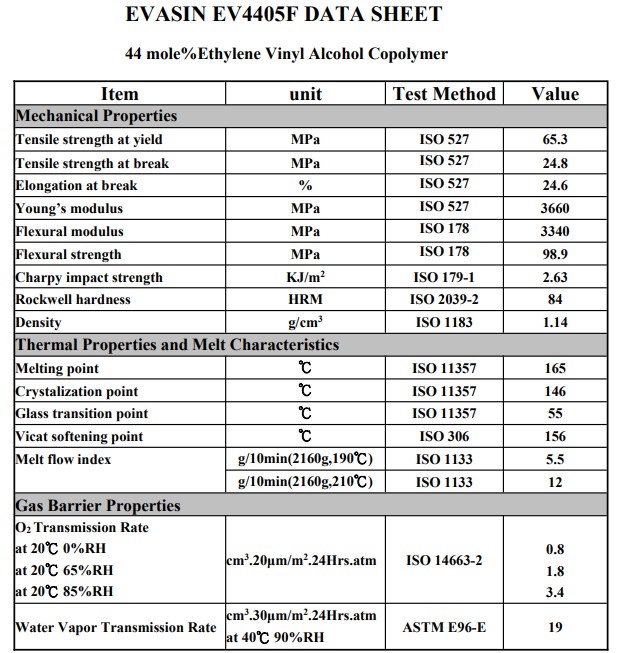 La resina EVASIN EVOH es una copolímero de etileno-alcohol vinílico, utilizado para fabricar películas, láminas y envases con altas propiedades de barrera al oxígeno. La serie EVASIN ofrece varios grados de composición y propiedades reológicas adecuadas para diversas técnicas de procesamiento, como coextrusión multicapa, fundición, moldeo por soplado, moldeo de láminas, moldeo por soplado, estiramiento biaxial, moldeo por inyección y moldeo por extrusión. El contenido de etileno de la resina EVASIN EVOH está relacionado con sus propiedades de barrera; un menor contenido de etileno da como resultado mayores propiedades de barrera al oxígeno, y mayores propiedades de barrera conducen a una mayor dureza de la resina. EVASIN EVOH (EVOH EW-3201Posee excelentes propiedades de barrera contra gases, bloqueando diversos olores provenientes de condimentos, especias, cosméticos, etc., lo que lo hace idóneo para el envasado de alimentos. Además, presenta una excelente resistencia al aceite y propiedades de barrera contra aceites y disolventes químicos, encontrando así aplicaciones en depósitos de combustible para automóviles, envases de pesticidas y tuberías de calefacción por suelo radiante.
