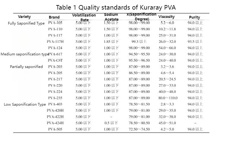 Industrialmente, el PVA se produce mediante la polimerización y posterior saponificación del acetato de polivinilo. Sus propiedades fundamentales dependen de su grado de polimerización y saponificación. La mayoría de los PVA disponibles comercialmente presentan un grado de polimerización de 200 a 4000 y un grado de saponificación de entre el 30 % y el 99,9 % en fracción molar. Las principales variedades de PVA producidas por Kuraray (Kuraray PVA) se muestran en las Tablas 1 y 2.
