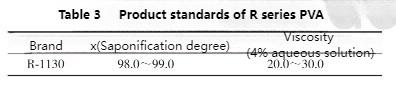 La serie R es un PVA modificado con grupos silanol. La Tabla 3 enumera los estándares de calidad de los productos de la serie R.