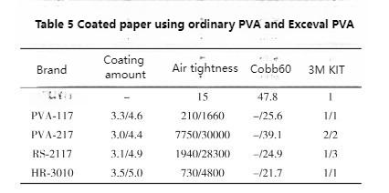 La Tabla 5 muestra que el recubrimiento con Exceval PVA RS-2117 logra una resistencia al aire aproximadamente equivalente a la lograda con el recubrimiento parcialmente saponificado. PVA-217, a la vez que reduce significativamente la absorción de agua. El papel recubierto con PVA parcialmente saponificado presenta una mayor resistencia al aire. Esto se debe a que el PVA parcialmente saponificado, altamente hidrofóbico, presenta una menor tensión superficial en solución acuosa, lo que inhibe su penetración en el papel. Sin embargo, el PVA parcialmente saponificado sufre una reducción significativa de la resistencia al agua. Si bien el Exceval PVA, modificado con un grupo hidrofóbico especial, está completamente saponificado, presenta la misma permeabilidad que el PVA parcialmente saponificado, ofreciendo una mejor resistencia al agua y al aire.