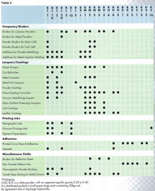 S-LEC B/K resin is also useful in coatings and varnishes because it sticks well to many surfaces like metals, plastics, and glass. Also, it works well with other resins for crosslinking, which is a key advantage.
