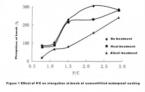 (3) When using cement to prepare JS waterproof coatings, adjusting the formula with P/C generally follows that as P/C increases, the tensile strength of the coating film decreases, while the elongation at break increases. However, this pattern applies within a certain P/C value range, and the P/C value range varies among different types of cement. Therefore, it needs to be determined through testing in application.