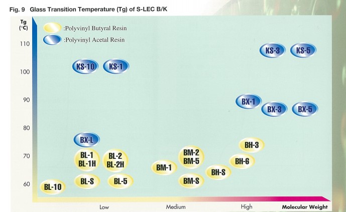 • S-LEC K (High Tg Type): S-LEC K resin utilizes shorter acetaldehyde side chains (R:CH3), resulting in a denser molecular chain packing and achieving the highest Tg value in the series. For example, both KS-3 and KS-5 can reach a Tg of 110°C, making them ideal materials for applications requiring high thermal stability, such as bonding electronic components.